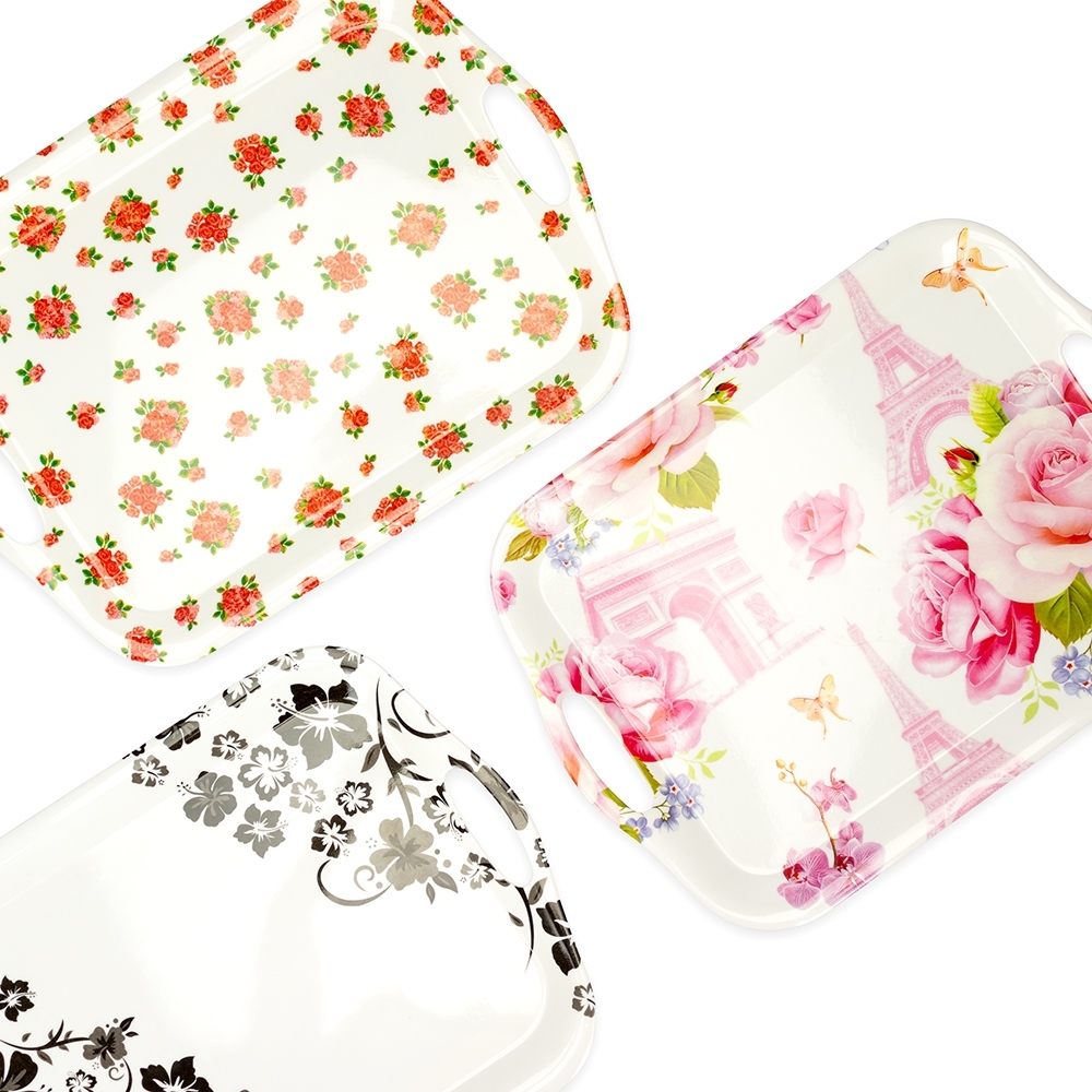 Uma bandeja retangular versátil feita em melamina material leve, resistente e fácil de limpar. Conta com um par de alças laterais para facilitar o transporte.