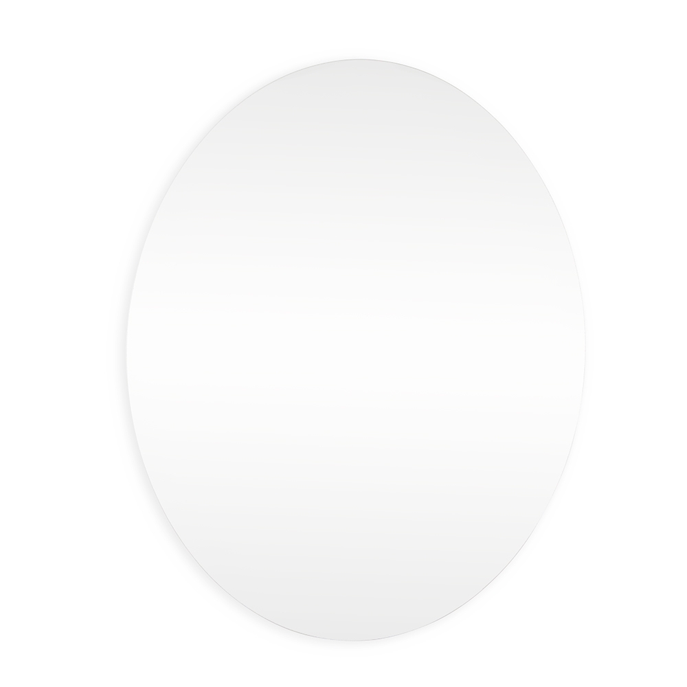 Espelho oval em acrílico com fundo adesivo para fixação em paredes e outras superfícies lisas.