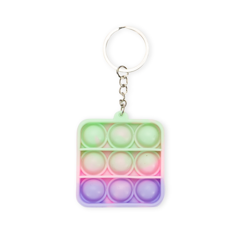 Chaveiro antiestresse feito em silicone de acabamento macio com argola metálica.
