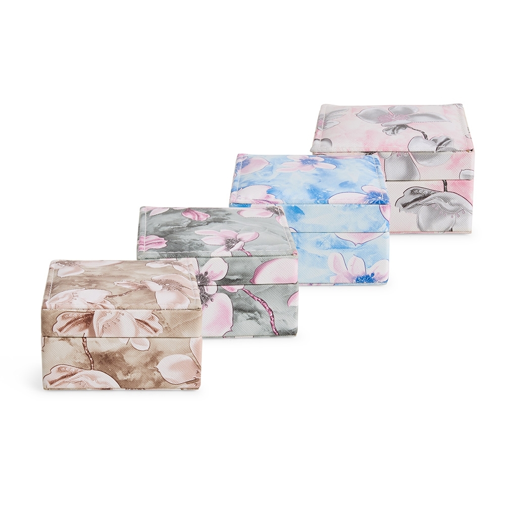 Porta-joias em couro sintético levemente texturizado e revestimento interno em veludo. Conta com espelho fixo no interior da tampa e um compartimento com três divisórias, uma delas com almofadas para anéis e brincos.