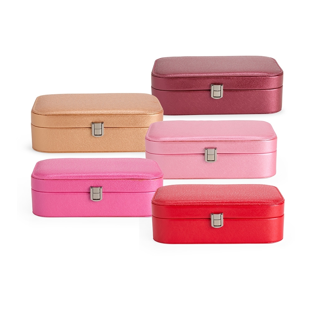 Porta-joias em couro sintético com detalhes texturizados e trava de segurança para fechamento. Possui revestimento interno aveludado, um espelho retangular fixo e seis compartimentos em tamanhos diferentes, incluindo divisória com almofadas para guardar anéis.