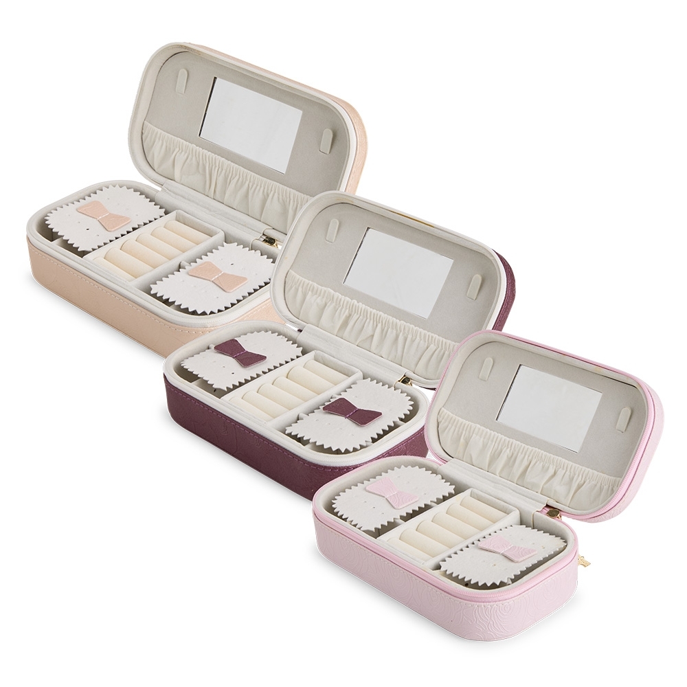 Porta-joias em couro sintético e fechamento em zíper com puxador que remete ao formato da torre Eiffel. Possui revestimento interno aveludado, espelho retangular fixo, dois ganchos e bolso posicionados na parte interna da tampa, além de divisórias removíveis no compartimento principal e outra com almofadas para anéis e brincos.