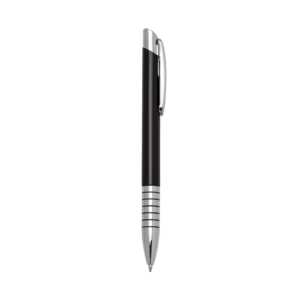 Caneta metálica com carga esferográfica azul e acionamento por clique.