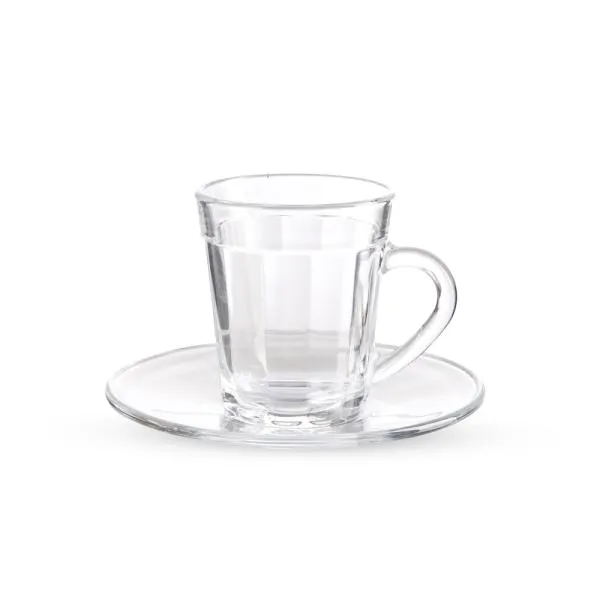 Xícara americano com pires em vidro.